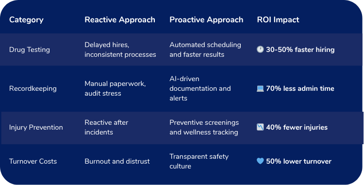 - Hidden Costs of Delays: Even without accidents, slow drug screening processes stall hiring pipelines. In a labor market already strained by high turnover, delays translate directly into production slowdowns and overtime costs.