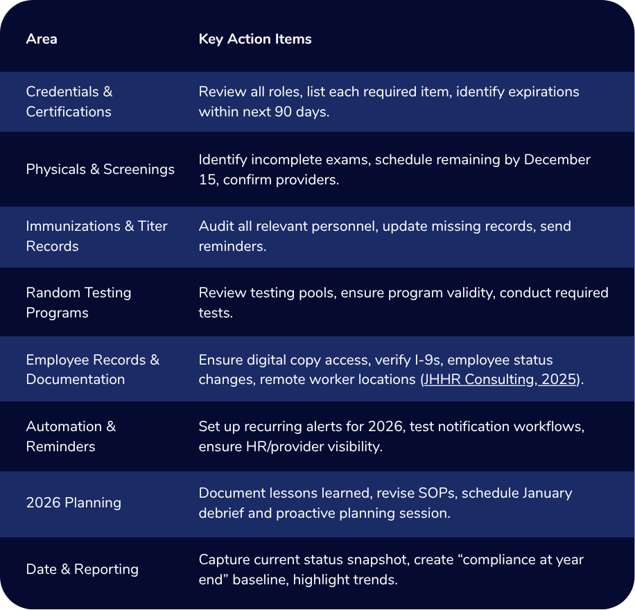 Year end isn’t just about holiday parties and handing out W-2s. For HR teams, it’s a critical tipping point. As the calendar turns, unfinished compliance tasks, expired credentials, incomplete documentation, and ad-hoc workflows all converge – creating risk, admin chaos, and delayed starts for the new year.