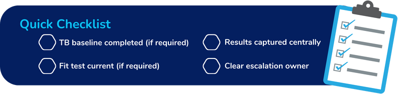 - Requirements vary by role and facility – two frequent gating items are baseline TB screening and respirator fit testing (where applicable).