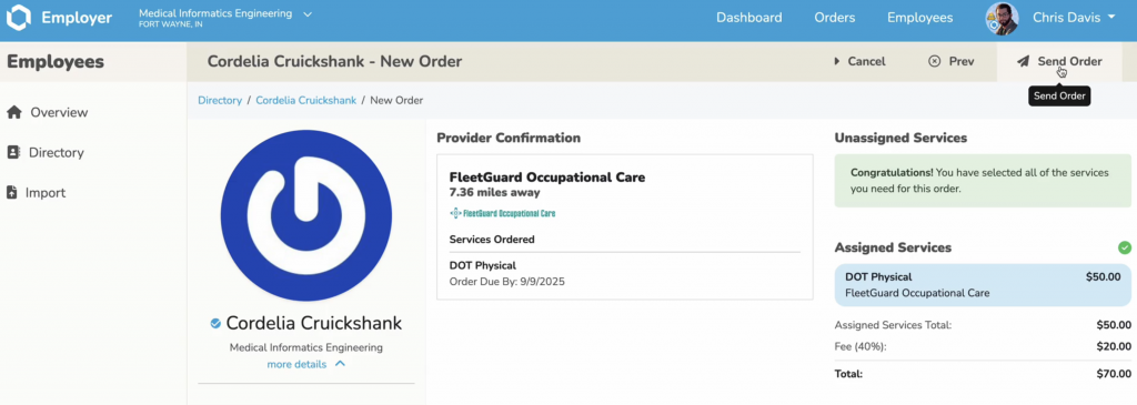 - Select Send Order
